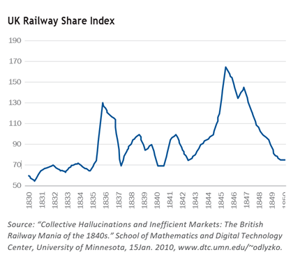 In the mid-1840s, England underwent a railway investment mania. The first railway lines had been built a decade earlier, and the returns to investors had been spectacular. Some of those original lines were by then paying 10-15% yields. In an investment landscape largely comprised of agricultural land (yielding 5%) and UK government loans (3-3.5%) those returns appeared magical. In 1844, Great Britain’s 2,000 track miles generated £5 million in revenue, against a national GDP of £500 million. Over the next three years, Parliament would approve 1,200 new lines entailing 8,500 track miles. The planned investment was £200-400 million. Based on the proposals submitted to Parliament, the expected revenues of the proposed lines would have had to reach £60 million, more than tenfold the 1844 revenues or roughly 12% of GDP by the early 1850s. To any reasonable person penciling out these numbers at the time, the economics would have appeared strained. But there was a fervor for the new technology and its ability to collapse time and distance.